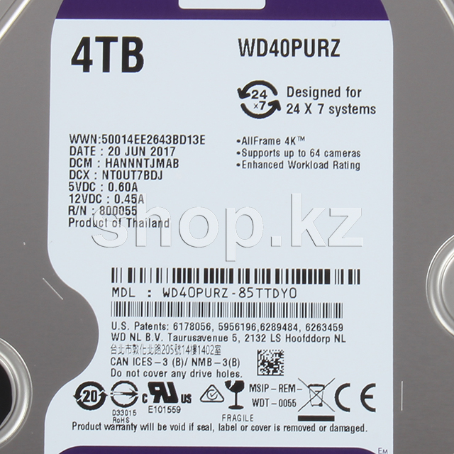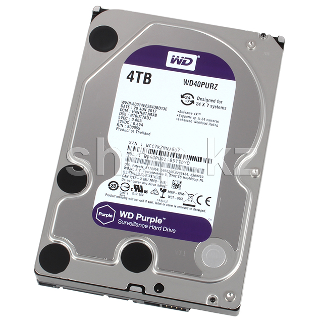 Жесткий диск HDD 4000 Gb Western Digital (WD40PURZ), 3.5", 64Mb, SATA III, Purple